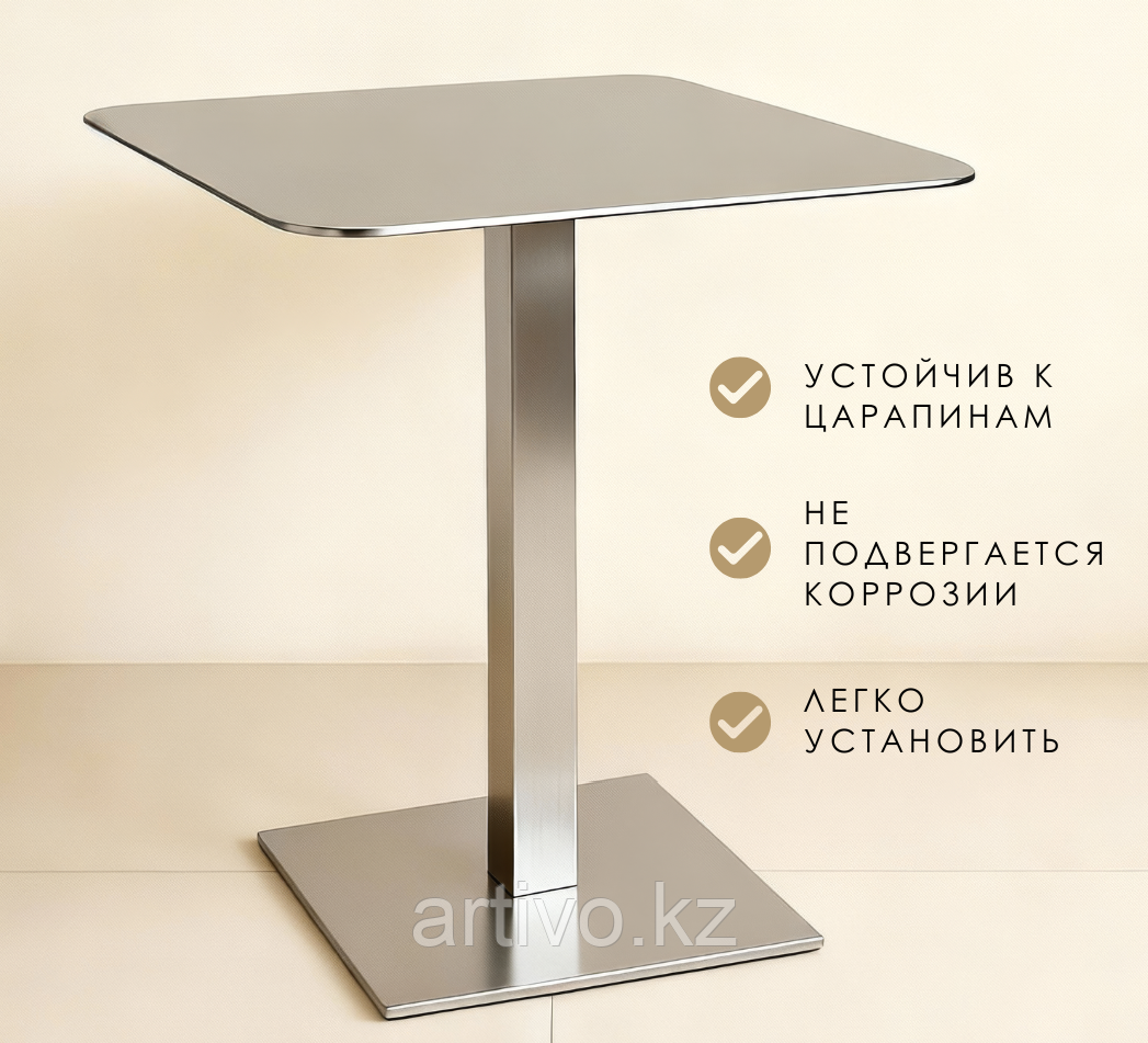 Современный обеденный стол Quadra из матовой нержавейки — это идеальное сочетание лаконичного дизайна и высокой функциональности. Благодаря квадратной форме и устойчивому основанию, он отлично подходит для кафе, ресторанов, отелей и современных офисов.